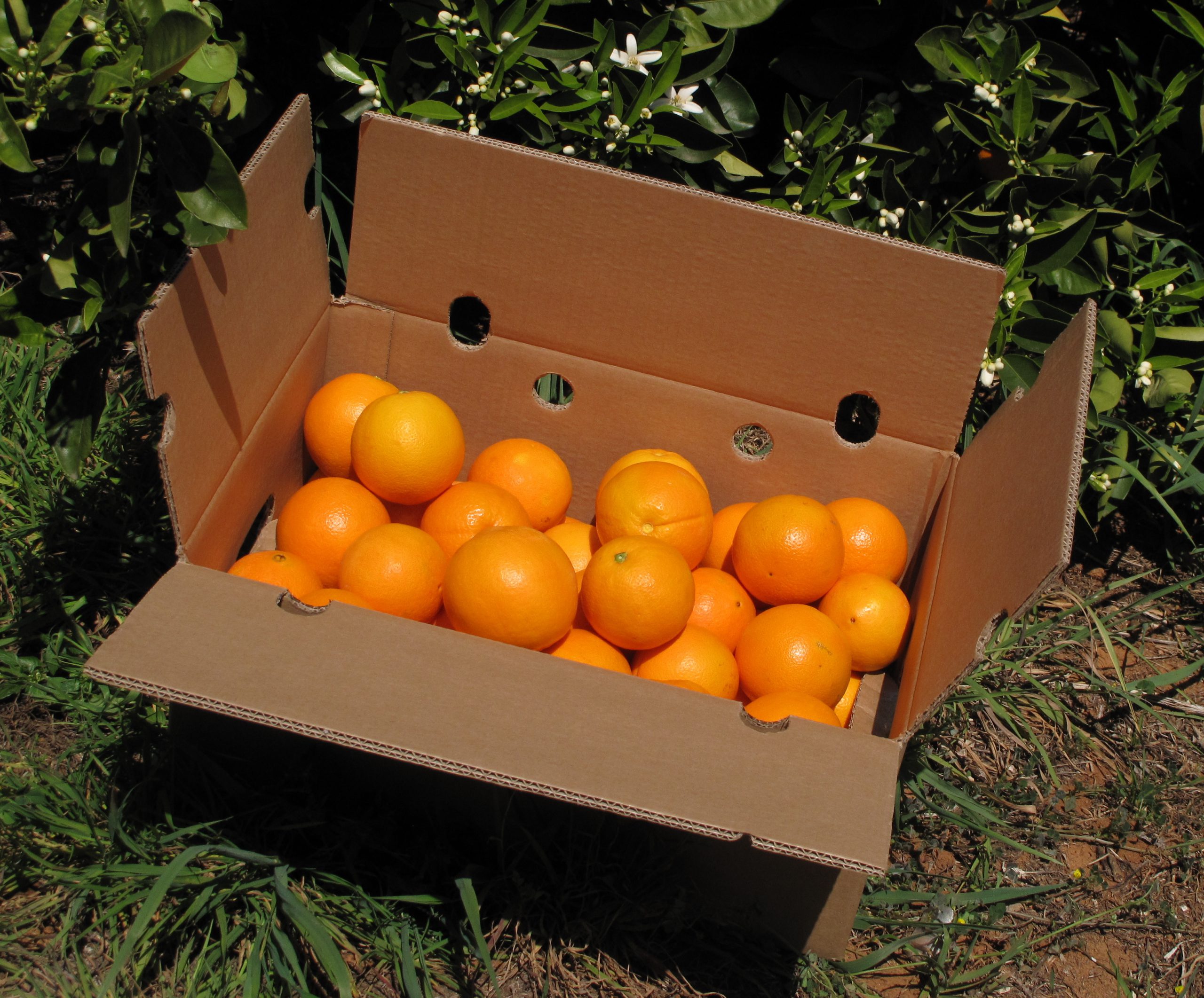 Caja de 20 kg de naranja Navel navelate cultivadas en el Huerto de San Eusebio en Carcaixent.